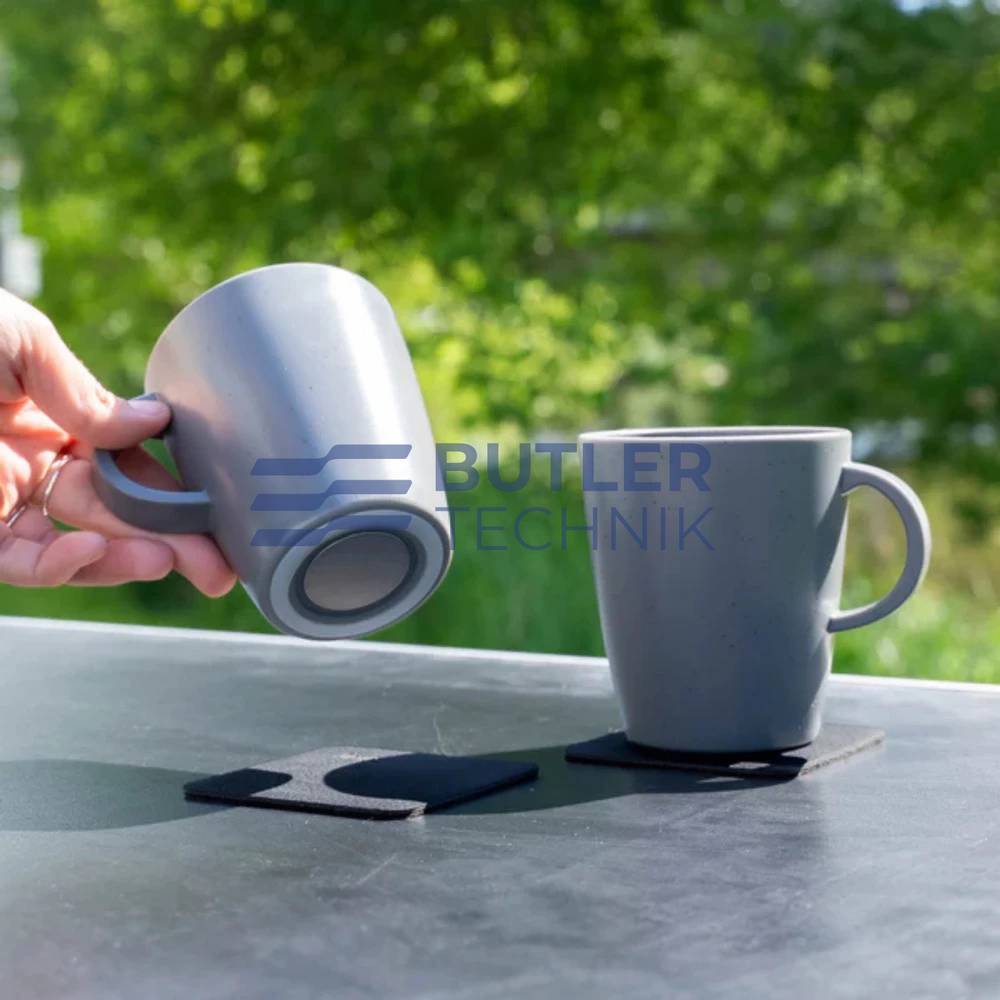 The base of the plastic cups is designed with a sophisticated hand-cast magnet. To ensure the cups remain secure during travel, they must be paired with a metal counterpole. This set comes complete with two metal nano-gel pads for this specific purpose. The magnetic cups and the metal nano-gel pads are perfectly calibrated in terms of force, allowing the cups to be firmly held by the pads while still being easily detachable for drinking. Additionally, the anti-slip coating on the bottom of the cups offers extra stability.