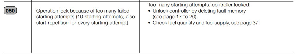 Fault code 50 is a lockout due to too many failed starts of the heater. Please check there are not any other fault codes that could indicate why the heater has failed to start in the first place.