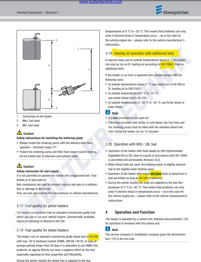 It's possible to run Eberspacher S3 D2L heaters on kerosene heating oil in most situations, but please consider it should be high qualiy, fresh and clean. Invariably it is the good housekeeping that causes early failure of the heaters, coking up etc, and not the actual fuel specification. For information I attach the specifications from the Eberspacher heater manual regarding fuel, it may be worthwhile speaking to your heating oil supplier regarding DIN spec.
